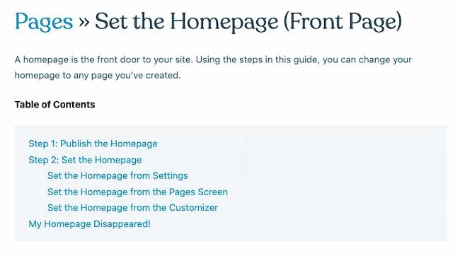 U wilt de tijd nemen om dit te vervangen door uw eigen aangepaste startpagina. Dit is de eerste indruk van een bezoeker van uw site en bedrijf. Dit betekent dat uw startpagina uw merk moet introduceren, uw producten of diensten kort moet uitleggen en de volgende stap moet aangeven die deze bezoekers kunnen nemen als ze klaar zijn met het verkennen van de pagina.