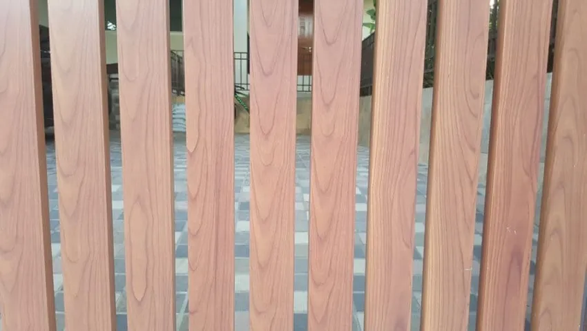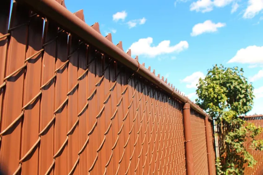 Hier is nog een ander voorbeeld van een hekwerk van vinyl en metaal. In tegenstelling tot de vorige hierboven, ziet dit hek er echter goed uit. Met zijn puntige punten en bruine kleur zou je het bijna kunnen laten doorgaan voor een houten hek.