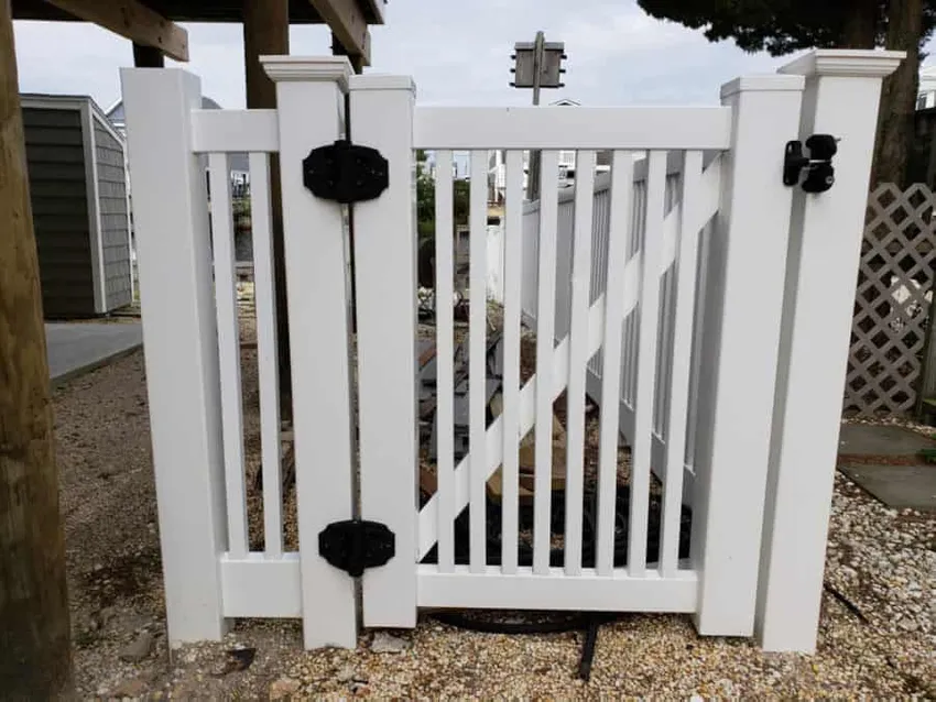 Hoewel de vinylpoort op de voorgrond er mooi uitziet, let op de crosshash-vinylomheining op de achtergrond. Net als houten kruishekken, zijn ooit gemaakt van vinyl perfect voor tuinen, waar je planten, sproeiers, verlichting en andere apparaten kunt ophangen.
