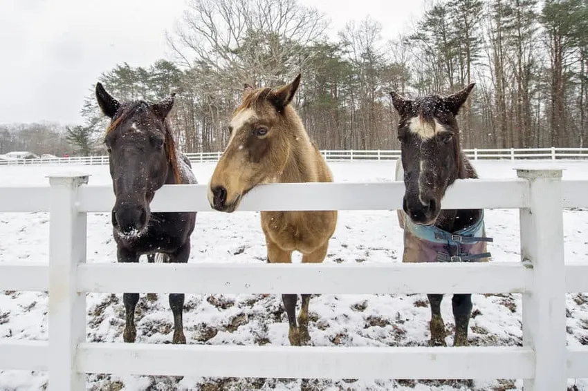 Sommigen hebben de misvatting dat vinylomheiningen week zijn en niet goed bestand zijn tegen de kou. Dit beeld zou smeken om te verschillen. Het is hartje winter, sneeuw is geen grond, en toch is deze omheining prima in orde. Sterk staan en het gewicht van drie leunende paarden kunnen dragen.