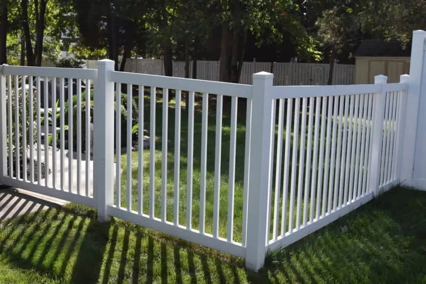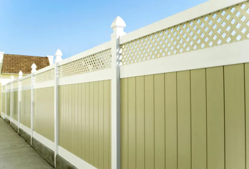 Veel eigenaren van vinylomheiningen nemen verschillende ontwerpen op in één enkele omheining. Sommigen gebruiken verschillende hoogtes, terwijl anderen ervoor kiezen om volledig verschillende omheiningsontwerpen te gebruiken. De hier getoonde heeft zowel een hoog, aaneengesloten traliehek als een kortere omheining met een tussenruimte.