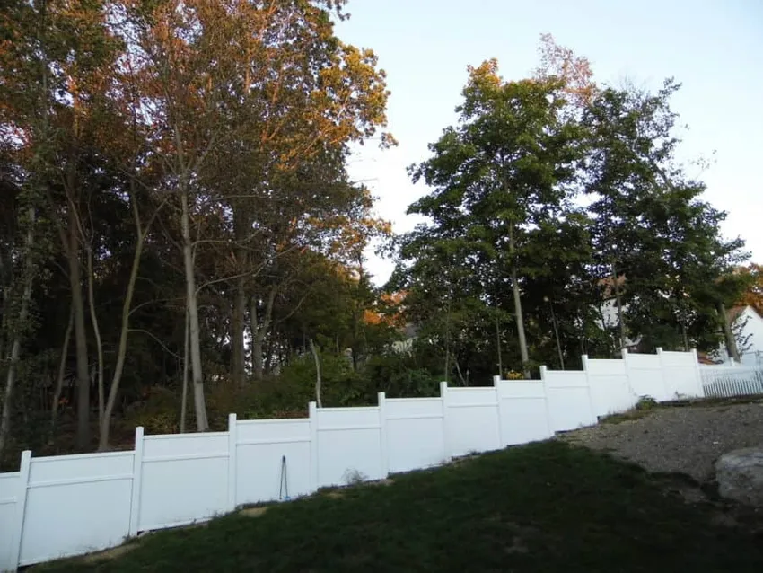 Denk je niet dat een vinylomheining goed zal werken op hellend terrein? Nou, denk nog eens na. Het hier getoonde hek maakt gebruik van een traptredeconstructie om volledige dekking langs een hellende heuvel te bieden. Ongeacht de steilheid, u kunt het traptredeontwerp of het schuine ontwerp gebruiken om elke heuvel te bedwingen.