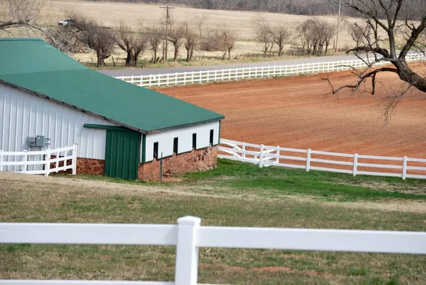 Deze ranch in Oklahoma heeft een vinylomheining ingebouwd in hun omheining. Met een gedeelte voor het grazen van dieren en een ander voor het planten van gewassen, is hun vinylomheining niet alleen een functionele scheidingswand, maar het past ook mooi bij de gevelbekleding van de stal.