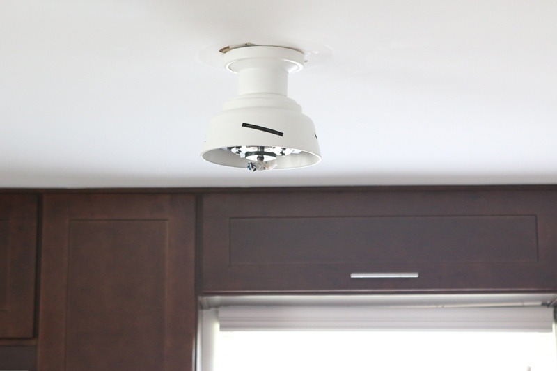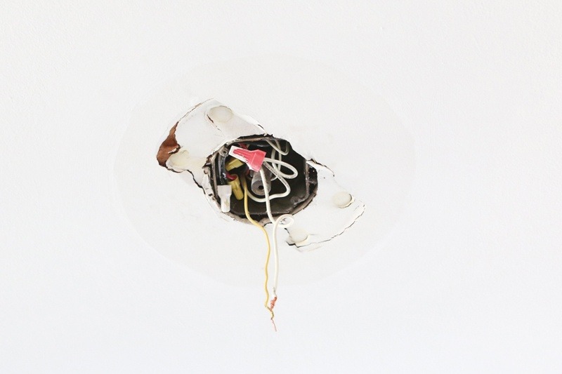 Vervolgens hebben we de draden netjes in het plafond gestopt en de basis van de luifel op zijn plaats geschroefd.