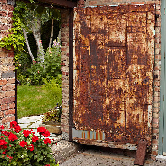 Uw buitendeuren hoeven geen visie van gepolijst hout en helder glas te zijn, vooral als dat niet de stijl van uw huis is. Buitendeuren kunnen een dramatischer statement maken, zoals deze stalen opening die zijn levensduur laat zien in het verweerde materiaal. Grootte is een andere manier om van uw buitendeur ook een stijlverklaring te maken: met een extra grote versie is er een gevoel van ontdekking en drama dat standaarddeuren vaak missen.