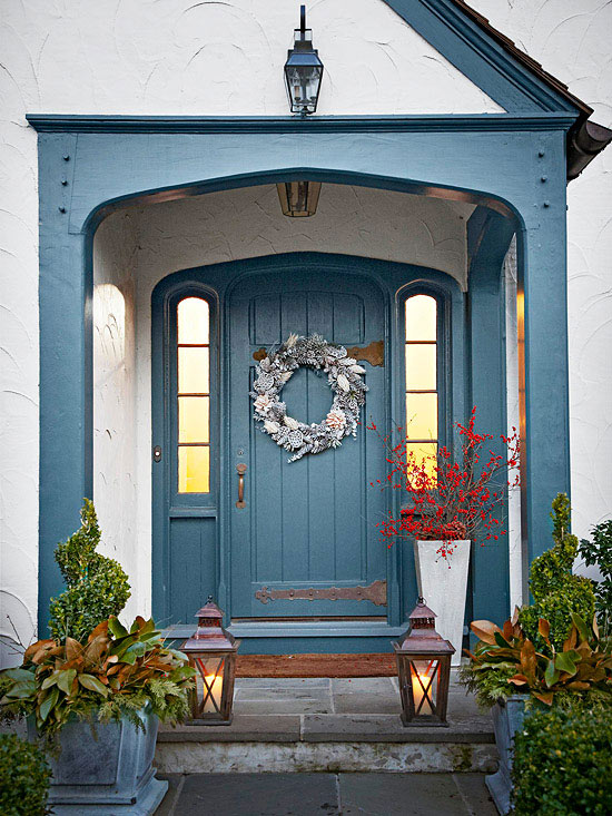 Een buitendeur hoeft niet gedurfd en flitsend te zijn om een waardevol ontwerpelement te zijn. Neem dit traditioneel beïnvloede stuk. Een ingetogen tint – de eerste hint van de ontwerpbeperking op het werk – pikt de koele ondertonen op in het grijsblauwe pleisterwerk van het huis. Horizontale metalen accenten dragen bij aan de klassieke uitstraling, net als de bijpassende stadslichten. Voor een vleugje kleur op een overwegend onopvallende opstelling als deze, ga je naar planten: heldere bessen in een hoge neutrale vaas zorgen voor een welkom contrast.