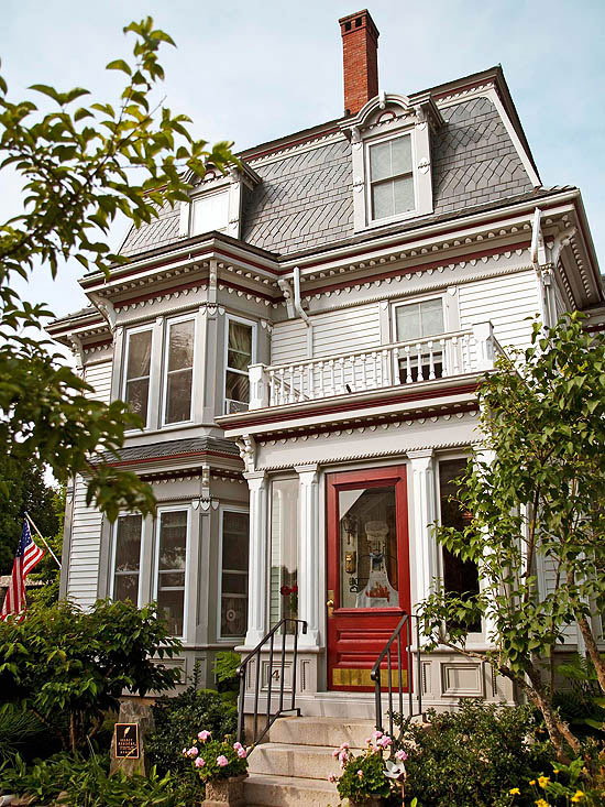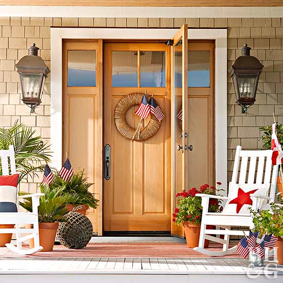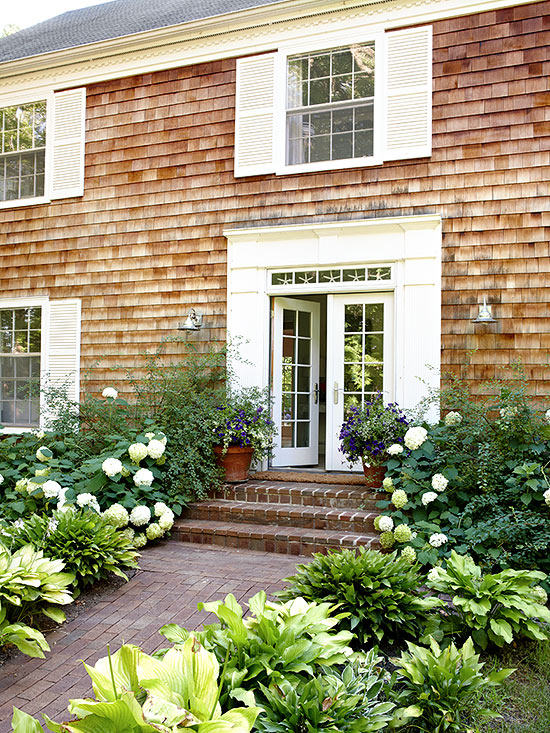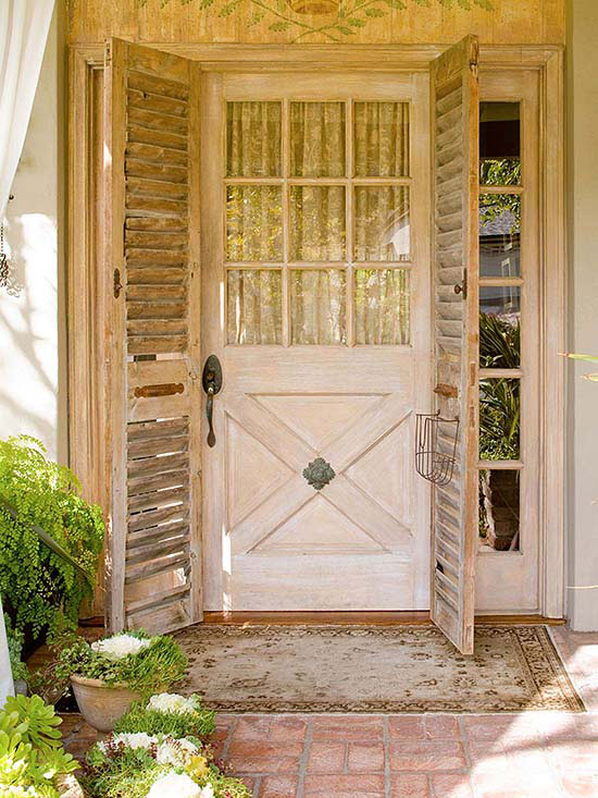 Net als elke andere ruimte aan de buitenkant van uw huis, bieden uw buitendeuren – en de ruimte eromheen – prachtige mogelijkheden om de architectuur van uw huis te accentueren en uw persoonlijke stijl te laten zien. Voorbeeld: de historische riff op deze voorgevel. Een verouderingstechniek op de voorste luiken en deur biedt vintage charme. Maar het paar biedt ook een secundair doel. Bij warm weer zijn de luiken stand-ins voor een traditionele hordeur. Bovenaan levert een delicaat sjablonerpatroon en een klein vleugje kleur. Andere ideeën voor geverfde afbeeldingen zijn de initiaal van de achternaam van uw familie, een bloem van een favoriete plant of details die zijn opgepikt van buitenversieringen.