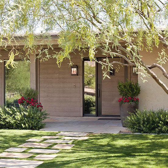 Hoewel symmetrie een natuurlijke keuze is voor meer klassiek ingerichte huizen, is er geen reden om stodgy en saai te zijn met uw keuzes voor buitendeuren. Zelfs een lichte ronding of een accentkleur kan het oog beweging, textuur en richting geven. Hier pakt de bovenkant van deze glazen deur de ronding van de ramen op, terwijl de donkere vlek een grafische hulp biedt aan mensen die op zoek zijn naar de voordeur.