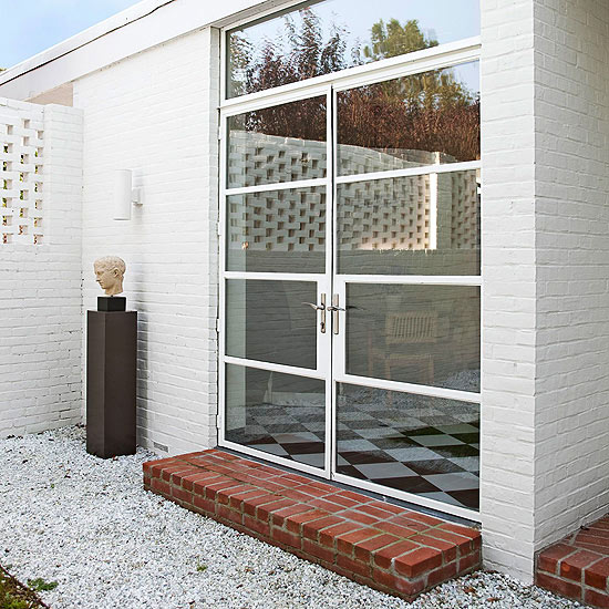 In een huis als dit – een eigentijdse knaller die allemaal van geverfde baksteen, staal en glas is – zou een deur van traditioneel formaat gemaakt van traditionele materialen niet op zijn plaats lijken. Het is een goed voorbeeld van waarom het belangrijk is om bij het kiezen van complementaire buitendeuren goed op zowel proportie als schaal te letten. Zorg daarnaast voor een plek voor mensen om buiten de deur te staan; het is nog een kans om ook een heldere kleur of een contrasterend patroon te introduceren.