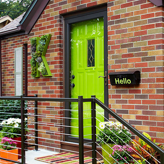 Als het om bakstenen huizen gaat, is het moeilijk om het kleurenschema van de buitenkant drastisch te wijzigen, tenzij u uw buitendeur natuurlijk in uw voordeel gebruikt. Let hier op de subtiele groene ondertonen in de baksteenpatronen; die kleurcue werd naar de rand van het heldere en lichte spectrum geduwd met een gewaagde limoengroene deur en accenten. Om de entree een afgewerkt gevoel te geven, kun je je kleurkeuze overal in verwerken, inclusief het buitentapijt en de bloempot (en zelfs een welkom op de brievenbus).