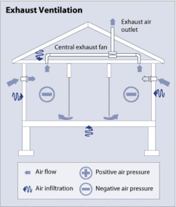 Afzuigventilatiesystemen werken door het gebouw drukloos te maken. Door de binnenluchtdruk te verlagen tot onder de buitenluchtdruk, onttrekken ze binnenlucht uit een huis terwijl suppletielucht infiltreert via lekken in de gebouwschil en via opzettelijke, passieve ventilatieopeningen.