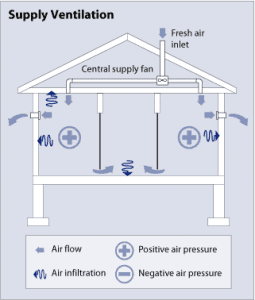 Toevoerventilatiesystemen werken door het gebouw onder druk te zetten. Ze gebruiken een ventilator om buitenlucht het gebouw in te persen, terwijl lucht uit het gebouw lekt door gaten in de schaal, bad- en ventilatorkanalen en opzettelijke ventilatieopeningen.