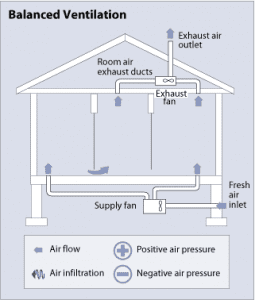 Gebalanceerde ventilatiesystemen brengen, indien correct ontworpen en geïnstalleerd, een huis niet onder druk of drukloos. Integendeel, ze voeren respectievelijk ongeveer gelijke hoeveelheden verse buitenlucht en vervuilde binnenlucht in en uit. Een balansventilatiesysteem heeft meestal twee ventilatoren en twee kanaalsystemen. Het zorgt voor een goede verdeling van verse lucht door toevoer- en afvoeropeningen op geschikte plaatsen te plaatsen.