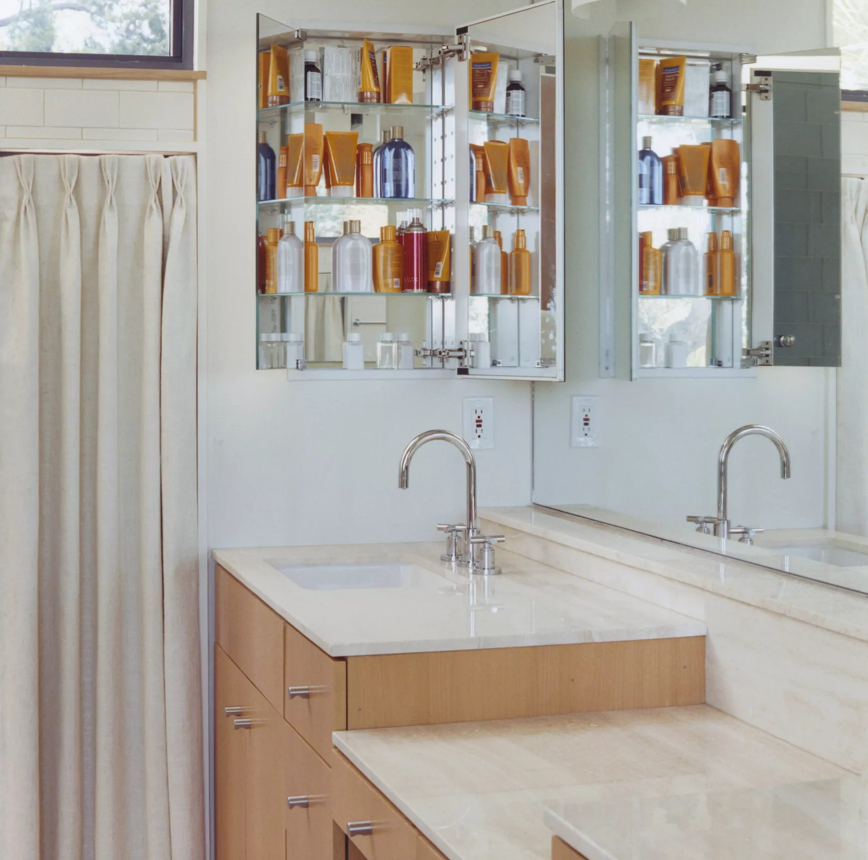 Krijg meer opbergruimte zonder in te boeten aan een strakke look met een verzonken medicijnkastje boven de ijdelheid. De extra muuromlijsting die nodig is om de kast in te bouwen, kost meestal niet veel in het grote schema van badkamerrenovatie.