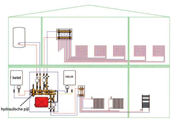 De hydraulische pijl (hydraulische pijl, hydraulische afscheider) dient voor het scheiden en verbinden van de primaire en secundaire circuits van het verwarmingssysteem. Tegelijkertijd wordt het secundaire circuit opgevat als een set warmtecircuits – vloerverwarmingslussen, radiatorverwarming en warmwatervoorziening.